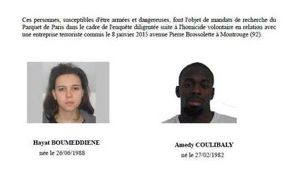 وحسب صورة فرقة مكافحة الجريمة، فالمتهمان هما "أميدي كوليبالي"، و"حياة بومدين". وطلبت الشرطة الفرنسية من المواطنين تقديم معلومات تفيد في الوصول إلى المشتبه بهما في قتل الشرطية أمس الخميس.