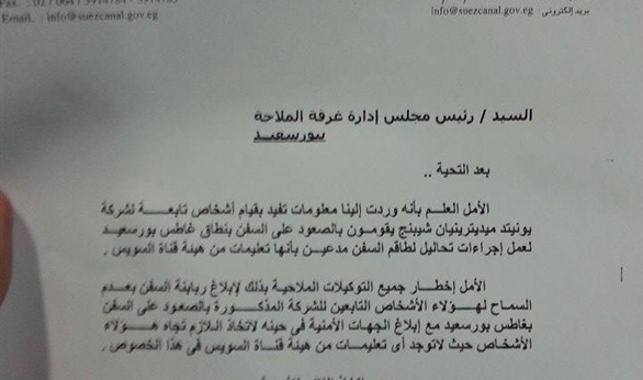 كما شددت هيئة قناة السويس فى خطابها الموجه إلى غرفة الملاحة على ضرورة سرعة إبلاغ جميع الجهات الأمنية فى حينه لاتخاذ اللازم تجاه هؤلاء الأشخاص، حيث لا توجد أى تعليمات من هيئة قناة السويس فى هذا الخصوص.