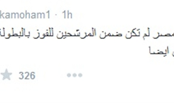 وقال ابوتريكة عبر حسابه الشخصي بموقع التواصل الإجتماعي تويتر: "فى الثلات بطولات التى فازت بها مصر لم تكن ضمن المرشحين للفوز بالبطولة.. أتمنى ان يحذر منتخب الجزائر وكل التوفيق لهم ولتونس ايضا".