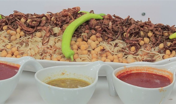 قدمي الكشري مع الصلصة والدقة والبصل المحمر.