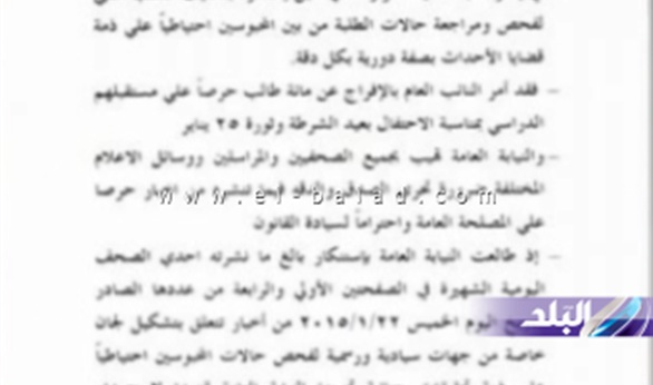 ننشر صورة بيان النائب العام بشأن الإفراج عن 100 طالب بمناسبة عيد الشرطة وثورة 25 يناير