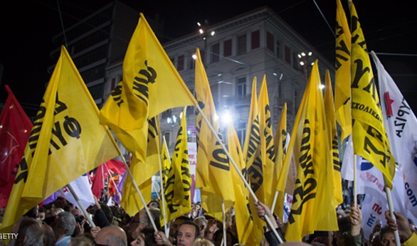 ويطالب ائتلاف اليسار الراديكالي "سيريزا" وهو اسم يعني "نحو الجذور"، باستقلال اليونان عن منطقة اليورو في حين يرفض حزب المحافظين الحاكم المنافس هذا الاقتراح، ويدعو إلى اعتماد البرنامج التقشفي وجدولة ديون اليونان.
