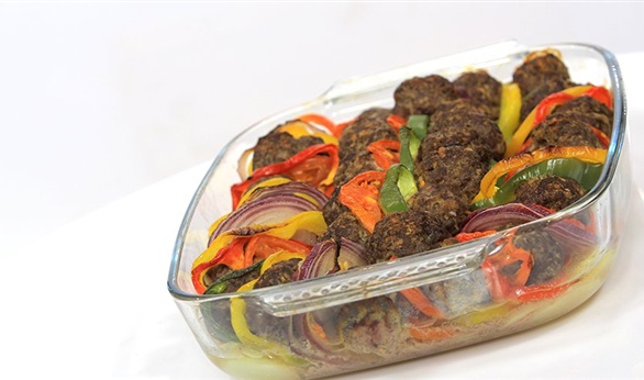 ضيفي فوقها الكفتة مع شرائح الفلفل والبصل والطماطم وادخليها الفرن على 220 درجة مئوية وقدميها ساخنة.