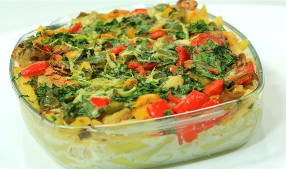 أضيفى الفلفل الألوان المقطع بالتتبيلة وباقى الصوص الأبيض