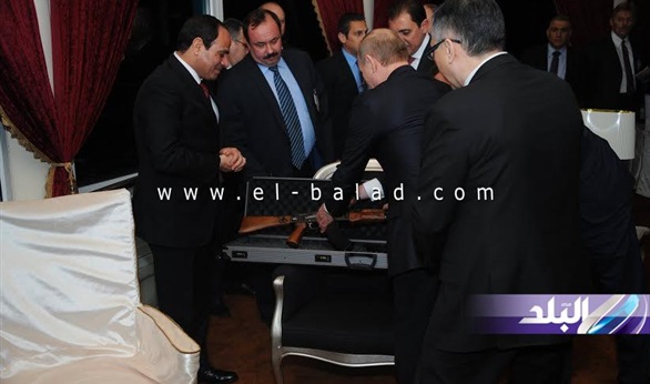 تبادل الرئيس عبدالفتاح السيسي رئيس الجمهورية ونظيره الروسي فلاديمير بوتين الهدايا التذكارية حيث أهدى بوتين للسيسي سلاح من طراز كلاشنكوف طراز "Ak-47 .