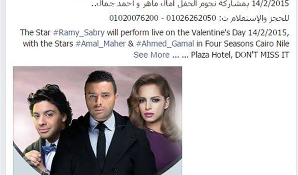 تم إلغاء حفل عيد الحب، والذى كان من المقرر أن يقام اليوم، السبت 14 فبراير، في فندق "فور سيزونز نايل بلازا" بالقاهرة، وكان من المفترض أن يحيى الحفل كل من رامي صبرى وآمال ماهر وأحمد جمال.