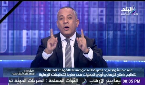 قال الإعلامي أحمد موسى، إنه يتمنى أن تقوم الطائرات المصرية قبل إقلاعها لدك معاقل "داعش" أن تقوم بدك "حماس" ومعسكراتها في غزة، مشيرا إلى أن هذا مطلب شعبي أن يجري الضرب هنا وهنا.