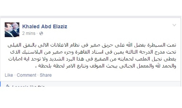 وكتب عبد العزيز عبر حسابه على "فيس بوك": "تمت السيطرة بفضل الله على حريق صغير فى نظام الاعلانات الالى بالنفق القبلى تحت مدرج الدرجة الثالثة يمين فى استاد القاهرة وجزء صغير من البلاستيك الذى يغطى نجيل الملعب لحمايته من الصقيع فى هذا البرد الشديد".