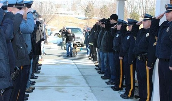 وودع أفراد الشرطة في بلدة وولويتش بولاية نيوجيرسي الأمريكية زمليهم السابق الكلب "جادج" البالغ من العمر 9 سنوات بحفل مهيب، في طريقه إلى مستشفى سويديسبورو، بعد أن خدم بإخلاص في سلك الشرطة، إلا أن المرض منعه من متابعة عمله.