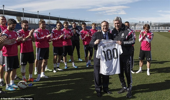 قام فلورنتينو بيريز رئيس نادي ريال مدريد الأسباني بزيارة تدريبات الفريق صباح اليوم، وذلك لتهنئة الإيطالي كارلو انشيلوتي المدير الفني للريال بوصوله لـلمباراة رقم 100 على رأس الإدارة الفنية للنادي الملكي واعطاه قميص تذكاري مكتوب عليه اسمه والرقم 100، كما قام بيريز بتهنئة القائد ايكر كاسياس بمناسبة وصوله للمباراة رقم 500 في الدوري الأسباني لكرة القدم واعطاه قميص تذكاري مكتوب عليه اسمه والرقم 500 .