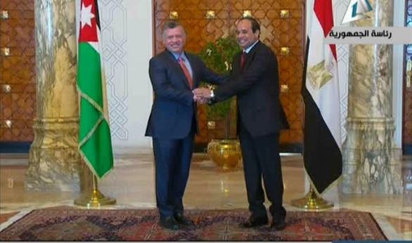 رافق الرئيس عبد الفتاح السيسي، الملك عبد الله الثاني، ملك الأردن، خلال تقديم حرس الشرف السلام الوطني للمملكة الأردنية الهاشمية ضمن مراسم الاستقبال الرسمية بقصر الرئاسة، كما استمع الرئيسان للنشيد الوطني لجمهورية مصر العربية.