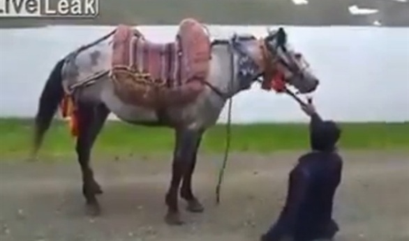 وثبت الرجل يديه على ظهر الحصان، وأخذ يجري بعض تمارين الضغط، ثم انطلق بالحصان، وعاد به مرة أخرى.