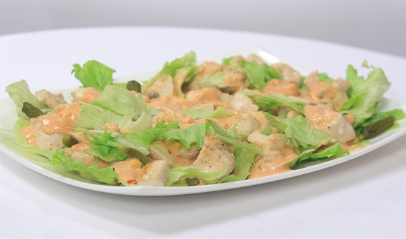 ضعي الخس في وعاء التقديم وفوقه الصوص ثم الدجاج ثم الصوص مرة أخرى.