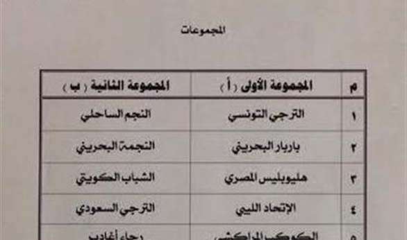 وأسفرت القرعة عن تقسيم الفرق لمجموعتين الأولى ضمت كلاً من الترجي التونسي، وباربار البحريني، وهليوبليس المصري، واتحاد طرابلس الليبي، والكوكب المراكشي المغربي.