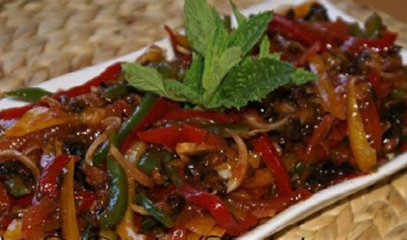 نقطع البصل والفلفل والطماطه الى نصف دائرة ونضعها فوق الباذنجان ويتبل ملح والفلفل وكجب وحامض وزيت الزيتون وتخلط وتوضع في الثلاجة لمدة ساعة وتقدم .