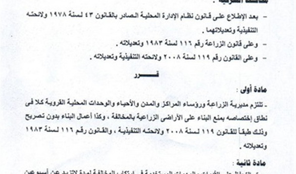 وقرّر المحافظ بأن تلتزم مديرية الزراعة ورؤساء المراكز والمدن والأحياء والوحدات القروية كلا في نطاق اختصاصه بمنع البناء على الأراضي الزراعية بالمخالفة، وكذا أعمال البناء بدون تصريح وذلك طبقاً للقانون 119 لسنة 2008 ولائحته التنفيذية، والقانون رقم 116 لسنة 1983 وتعديلاته.