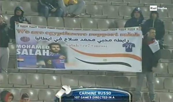 رفع المشجعون المصريون المتواجدون في ملعب أرتيمو فرانكي، لافتة كتب عليها "رابطة مشجعي صلاح في فيورنتينا"، كما كتبوا عبارة "رونالدو + ميسي = صلاح"، وذلك قبل انطلاق مواجهة الفيولا أمام ميلان في الجولة السابعة والعشرين للدوري الايطالي.