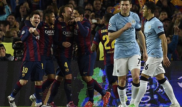 واصل برشلونة تفوقه على نظيره مانشستر سيتي الإنجليزي، بعد أن أنهى الشوط الأول بهدف نظيف أحرزه لاعبه إيقان راكيتش في الدقيقة الحادية والثلاثين في المباراة المقامة بينهما على ملعب الكامب نو في إياب الدور ثمن النهائي من دوري أبطال أوروبا لكرة القدم ليقترب خطوة جديدة نحو التأهل إلى دور الثمانية.