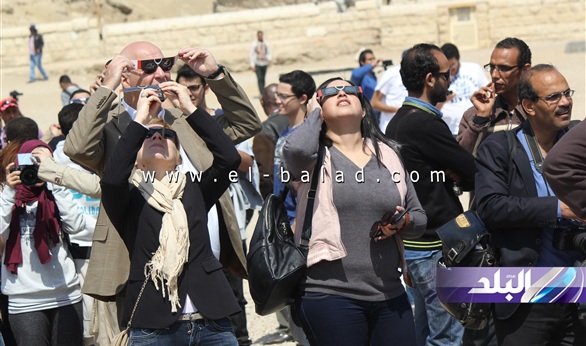 توافد العشرات من السائحين والمصريين وعلماء الفلك، منذ قليل، أمام تمثال أبو الهول بمنطقة أهرامات الجيزة، لمشاهدة لحظة كسوف الشمس.