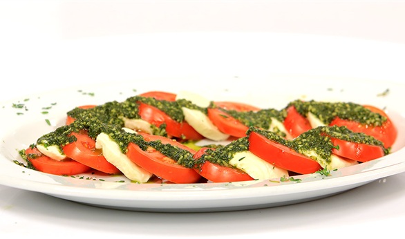 نشرح الطماطم وتحشى بشرائح الموتزاريلا وتسقى بصوص بستو الريحان الصوص: يطحن الثوم مع الملح والفلفل ويضاف الريحان و زعتر فريش ويطحن ثم يضاف الزيت والصنوبر على دفعات صغيرة ويطحن حتى يتكون صوص غليظ مع قطع من الصنوبر متفاوتة الحجم