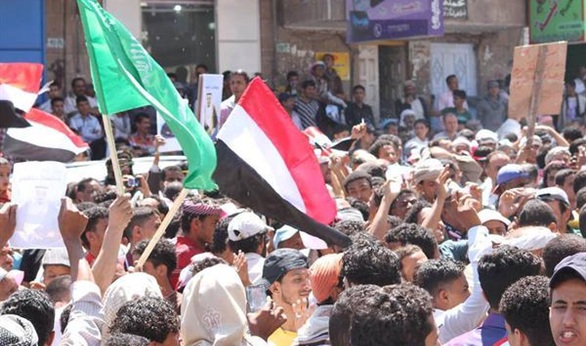 تظاهر مواطنون يمنيون بمنطقة تعز اليمنية تأييدا وترحيبا بعملية "عاصفة الحزم"، ضد جماعة الحوثى الانقلابية.