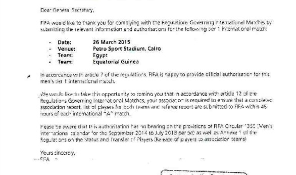 تلقى الاتحاد المصرى لكرة القدم خطابا رسميا من الاتحاد الدولى يوجه فيه الشكر على الالتزام بلوائح الفيفا للمباريات الدولية واعتماد مباراة اليوم امام غينيا الاستوائية رسميا.