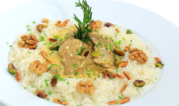 قطعى اللحمة لقطع متوسطة تبلى اللحمة بالملح والفلفل الأسود شوحى اللحمة فى الزيت على النار ( نصف تسوية ) شوحى البصل والثوم المفرومين فى الزيت على النار فى نفس طاسة تشويح اللحمة أضيفى المستردة وبودرة الديمى جلاس والكريمة اللبنانى وقلبى أضيفى لقليل من مرقة اللحمة أضيفى قطع اللحمة وإتركيها فى الصوص حتى النضج ضعيه فى طبق التقديم مع لأرز البسمتى الأبيض وزينيها بعود روزمارى والمكسرات المحمصة فى القليل من الزيت.