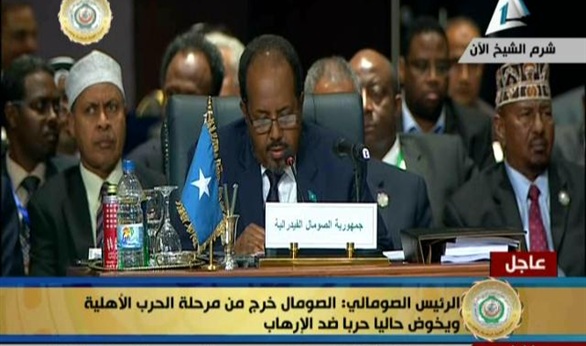 وأضاف شيخ محمد، خلال كلمته أمام القمة العربية الـ"26" المنعقدة بمدينة شرم الشيخ، إنه يطلب المساعدة والدعم من الدول العربية في إعمار "الصومال" من خلال مؤتمر تحت إشراف الجامعة، لافتاً إلي أن هذا الأمر سيوفر العديد من فرص العمل للشباب ويلعب دوراً كبيراً في الإصلاح الاقتصادي، وكذلك طالب بالتعاون الأمني مع كافة الدول العربية لمساعدة بلاده.