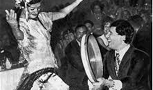 وفي هذه الصورة النادرة يظهر فيها العندليب الاسمر "حليم" وهو يضرب على (الدف)، بينما نجوي فؤاد تتألق برقصاتها وحركاتها الاستعراضية.