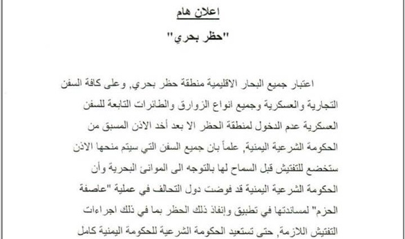 وقالت في إعلان هام بعنوان "حظر بحري" إن على كافة السفن التجارية والعسكرية وجميع أنواع الزوارق والطائرات التابعة للسفن العسكرية عدم الدخول لمنطقة الحظر إلا بعد أخذ الإذن المسبق من الحكومة الشرعية اليمنية.