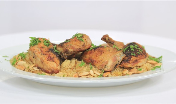 تبلي الدجاج بالملح والفلفل وتوابل الدجاج وبودرة الحبهان ثم شوحي الدجاج في الزيت وادخليها الفرن حتى تنضجفي وعاء جديد شوحي البصل وضيفي له الكسكسي وقليل من المرقة وقدمي الكسكسي مع الدجاج ساخنا ويمكنك تزينه باللوز والبقدونس.