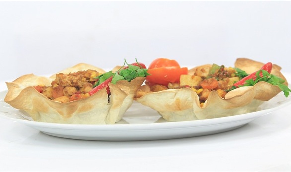 قطعي الدجاج مكعبات صغيرة ثم ضعيها في طاسة بها زيت ساخن على النار قطعي الجزر مكعبات واضيفيه الى الطاسة وكذلك الفلفل الألواناضيفي البابريكا والكمون واستمري في التقليبباستخدام كبة كهربائية افرمي البصل والثوم والفلفل الحار والكرفس والجزر ثم اضيفيه الى الطاسة ادهني قالب فرن بالزيت وضعي فيه رقائق التورتيلا ليتحمص اضيفي مكعب مرقة وقليل من الماء ثم الذرة الصفراء واستمري في التقليب قطعي البطاطس مكعبات واقليها في زيت غزير ثم صفيها واضيفيها للطاسة واتركيها على نار هادئة حتى تنضج تماما ثم قدميها في عيش التورتيلا المحمص.