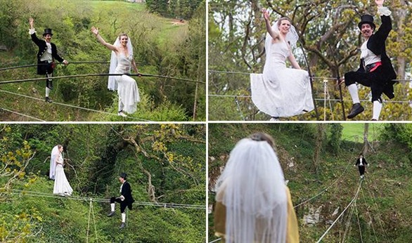 احتفل زوجان بريطانيان بزفافها بطريقة مبتكرة، وذلك سيرا على الحبال، وتبادلا عهود الزواج على ارتفاع 25 مترا فوق رؤوس المدعوين، في أول زفاف من نوعه في البلاد.