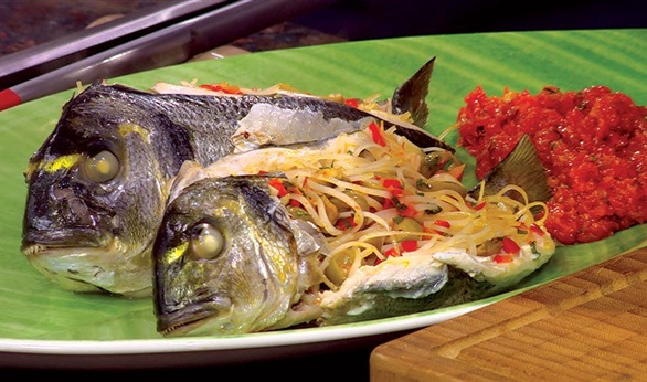 نضع السمك في صينية مدهونة بالزيت وتغطي بورق مطبخ وورق فويل تدخل الفرن علي درجة حرارة 170 وتقدم ساخنة مع صلصة الطماطم و يزين بالليمون الحامض.