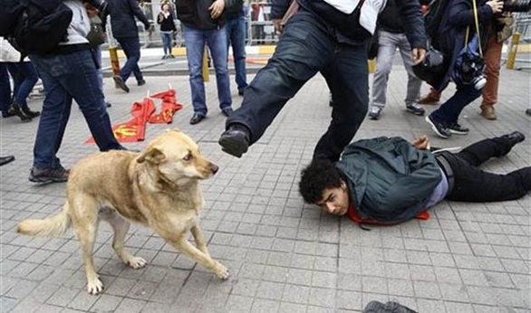 نشرت صحيفة حريت التركية مقطع فيديو يظهر فيه أحد الكلاب التي قامت بمطادرة السيارة التي استقلها أفراد الشرطة بعد التصدي لإحدى المظاهرات التي نظمتها قوى اليسار في تركيا بمناسبة عيد العمال أمس الجمعة بميدان تقسيم بمدينة اسطنبول.