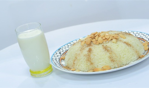 ثم حمري اللوز المقشر عند تقديم الأرز ضعيه في طبق التقديم على شكل هرم وزينيه باللوز والقرفة والسكر الناعماضيفي ماء الزهر الى اللبن وقدميه إلى جانب الطبق.