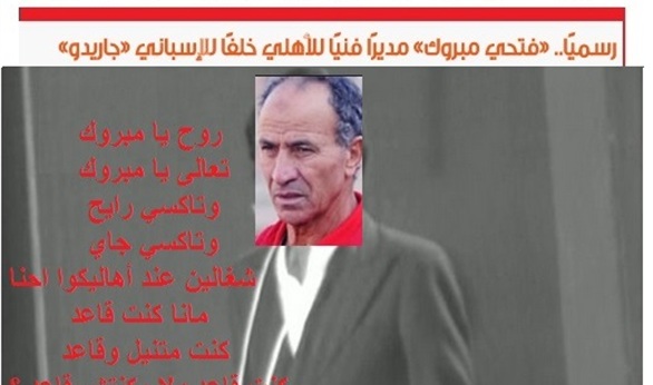 تداول نشطاء على موقع التواصل الاجتماعي فيسبوك صورة ساخرة لفتحي مبروك المدير الفني الجديد للنادي الأهلي والذي تولى مهمة تدريب الفريق خلفا للمدرب الأسباني خوان كارلوس جاريدو.