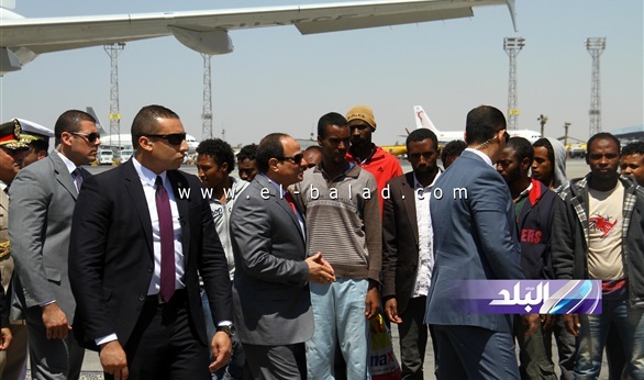 وفور وصول الإثيوبيون إلي المطار صافحوا الرئيس السيسي وكان بعضهم يحمل الأعلام المصرية، ورددوا عبارات الشكر والثناء للرئيس ولمصر وهتفوا:"تحيا مصر".