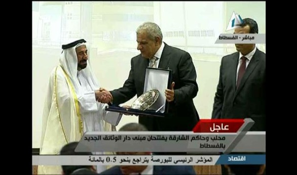 منح رئيس الوزراء المهندس إبراهيم محلب، الشيخ سلطان القاسمي حاكم الشارقة، درعا تكريميا، تقديرا لجهوده وجهود دولته في افتتاح مبنى دار الوثائق الجديد بالفسطاط.