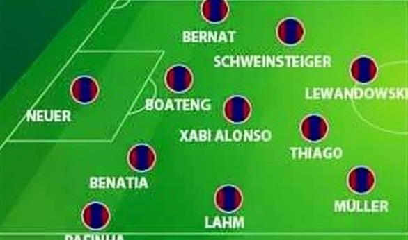 مانويل نوير فى حراسة المرمى وفى خط الدفاع الرباعى بيرنات وبواتنج وبن عطية ورافينيا وبخط الوسط الثلاثى شفاينشتايجر والونسو وفيليب لام وفى الهجوم الثلاثى ليفاندوفسكي وتياجو ومولر.