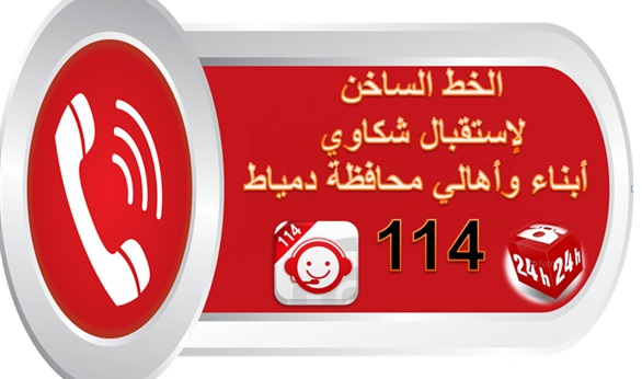 وأكد الدكتور اسماعيل عبدالحميد طه محافظ دمياط,,انه تم تخصيص رقم 114 لتلقي شكاوى أبناء المحافظة في مختلف القطاعات والخط يعمل طوال 24 ساعة وهناك موظفون مسئولون باستقبال المكالمات والشكاوى واتخاذ الاجراءات الازمة بإبلاغ التنفيذيين المعنيين بشأن الشكاوى.