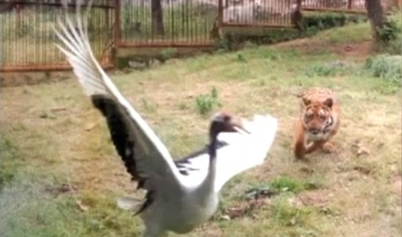 ويظهر، في الفيديو تم تسجيله من داخل محمية للحيوانات البرية بمقاطعة تشجيانغ الصينية، طائر "الكركية" وهو يحارب بشجاعة نمرين جائعين قاما بمحاصرته لتناوله كوجبة خفيفة على الغداء بعدما دخل إلى قفصهما من خلال ثقب في الجدار.