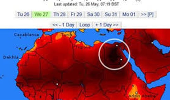 وكان موقع الطقس العالمي "weather online"، أعلن أمس أن مصر ستسجل أعلى درجات حرارة في العالم، الأربعاء 27 مايو 2015، وستصل درجة الحرارة إلى 49 درجة مئوية في الواحات البحرية والخارجة، أما القاهرة فتسجل 46 درجة.