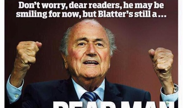 وعنونت الصحيفة البريطانية الشهيرة غلاف الجريدة بكلمات عنيفة مرفقة بها صورة بلاتر، وقالت: لا تقلقوا ربما هو يبتسم الآن .. لكن بلاتر رجل ميت يمشي.