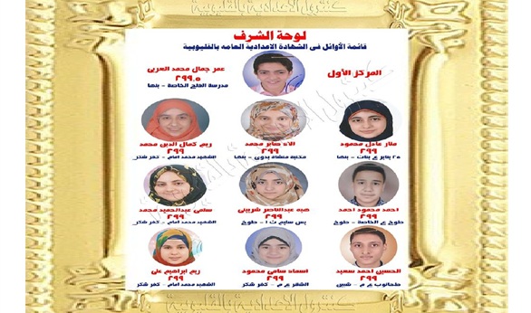 وجاء في المراكز التالية كل من منار عادل محمود 299 درجة مدرسة 25 يناير الاعداديه بنات وآلاء صابر محمد 299 درجة منشية بدوي الإعدادية وريم كمال الدين 299 درجة من مدرسة الشهيد محمد إمام كفر شكر وأحمد محمود أحمد مدرسة طوخ الخاصة، وهبه عبدالناصر شربيني مدرسة ياسين سليم طوخ وسلمى عبدالحميد مدرسة الشهيد محمد إمام كفر شكر والحسين أحمد سعيد مدرسة طحانوب بشبين القناطر، وأسماء سامي محمود مدرسة الشقر الإعدادية كفر شكر وريم إبراهيم على مدرسة الشهيد محمد إمام كفر شكر.