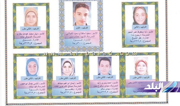 والطالبة نانسى جمال أحمد أبوعجور 299.5 درجة "فوه" الثانى مكرر ، محمد مصطفى عيد سمرة 299.5 درجة "كفرالشيخ" الثانى مكرر ، عزالدين إبراهيم جابر 299.5 درجة "كفرالشيخ" الثانى مكرر ، نرمين سمير أحمد قنديل 299.5 درجة "سيدى سالم" الثانى مكرر ، محمود أحمد يوسف إبراهيم 299.5 درجة "سيدى سالم" الثانى مكرر ، نور ممدوح محمد الخولى 299.5 درجة "دسوق" الثانى مكرر ، رويدا شعبان شفيق شعبان 299.5 درجة "بلطيم" الثانى مكرر ، أحمد عبدالفتاح محمد الجزار 299.5 درجة "دسوق" الثانى مكرر ، محمد على أحمد وهبة 299.5 درجة "دسوق" الثانى مكرر.