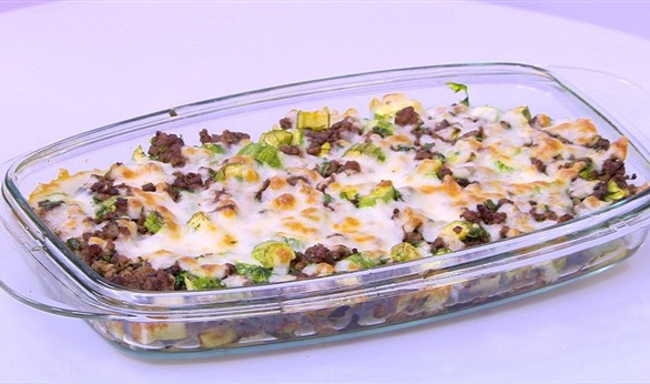 إخلطى البقدونس مع اللحمة المعصجة أضيفى الخليط على الكوسة والباذنجان أضيفى الجبنة على الوجة وأدخلى البايركس الفرن حتى تمام النضج ثم قدميه.