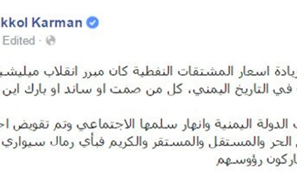 وأضافت كرمان، عبر حسابها على موقع التواصل الاجتماعى "فيس بوك"، "ها قد سقطت الدولة اليمنية وانهار سلمها الاجتماعى، وتم تقويض أحلام الشعب فى المستقبل الحر والمستقل والمستقر والكريم، فبأى رمال سيوارى أولئك الصامتون والمباركون رؤوسهم".