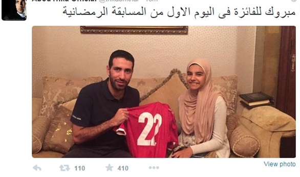 ومنح أبو تريكه الجائزة للفائزة الأولى، ونشر صورة تسليمه لها للتي شيرت الجائزة.