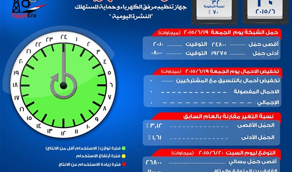 توقع مرصد الكهرباء بجهاز تنظيم مرفق الكهرباء وحماية المستهلك أن تكون هناك زيادة في الإنتاج المتاح عن الأحمال اليوم السبت قدرها 1100 ميجاوات، مشيرا إلى أنه لم يتم أمس الجمعة تخفيض أي أحمال سواء عن طريق الفصل الإجباري أو تخفيض أحمال بالتنسيق مع المشتركين.